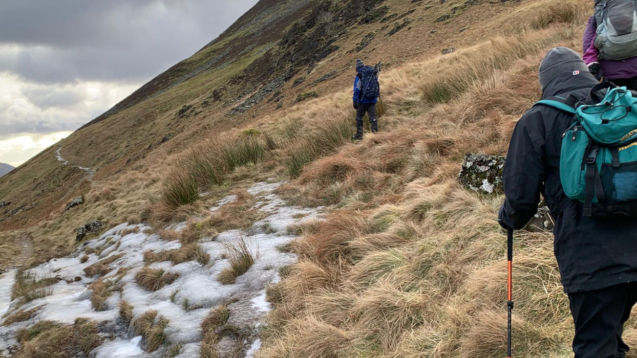 Eight of us and Bella the dog enjoyed a winter walk of 9-11 miles. As Robin was willing to chance the Underscar car park, he kindly agreed to head back to a group members house for her forgotten boots. The other half of us started on Brundholme Road and so completed an extra mile or so. We all met up and ventured up the very steep slope towards Skiddaw. Once half way we decided as a group to just go up Skiddaw Little Man and Lonscale Fell and Pike today. It was bitingly cold but not windy, there was lots of ice and thick frost/snow on the tops. Skiddaw itself was covered by cloud and so we gave that one a miss today. We decided to take on Bruce’s idea of heading over Burnt Horse Ridge for an extended way down. He didn’t mention the very steep hill descent. But we ventured carefully down the frozen grass/mud holding the fence and we were fine. We circled down and round past frozen paths and waterfalls, and past Lonscale Crags.