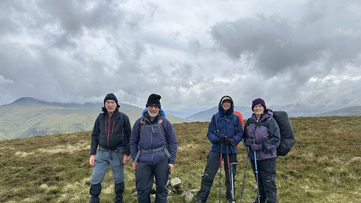 From North face car park. The 3 musketeers braved the tougher and longer route. We’d been at the top for a little while and then saw them approaching through the mists from the steeper North side. Fantastic that we all met at the top for a group photo.